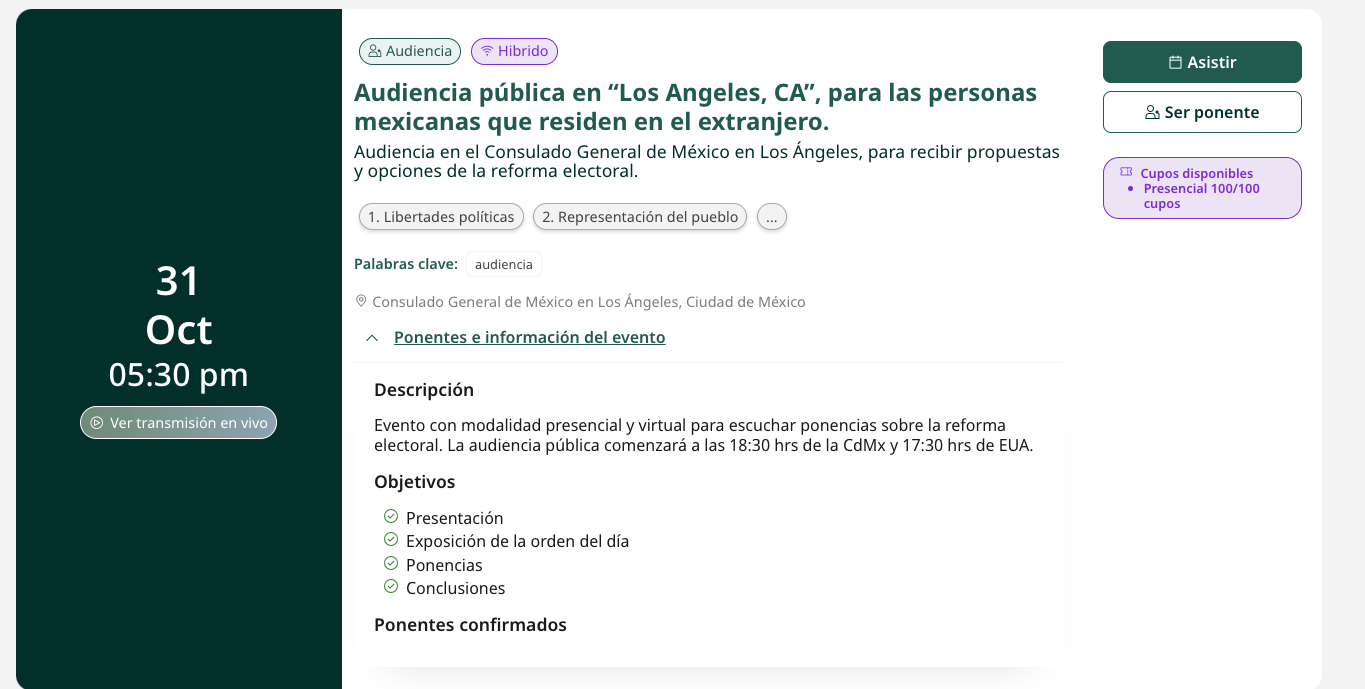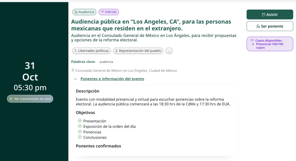 De este modo la discusión llegó a Los Ángeles y este próximo 31 de octubre, a las 05:30 pm hora local, se llevará a cabo una Audiencia Pública Híbrida en el Consulado General de México en Los Ángeles.