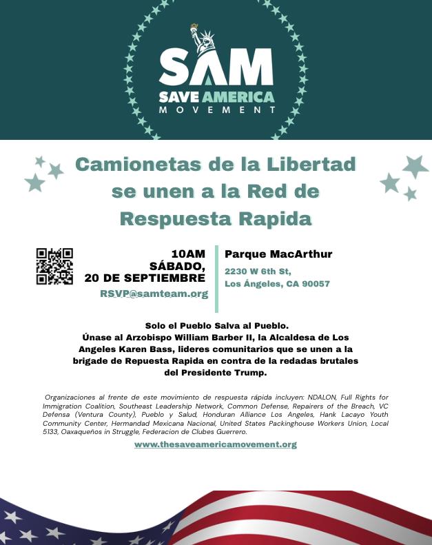 Save America Movement pidió a los angelinos a unirse como voluntarios, incluyendo abogados, clérigos y camarógrafos, para defender a las comunidades de las redadas. Se extendió una invitación a quienes deseen participar al evento inaugural, que se realizará este sábado 20 de septiembre a las 10 de la mañana en el parque McArthur.